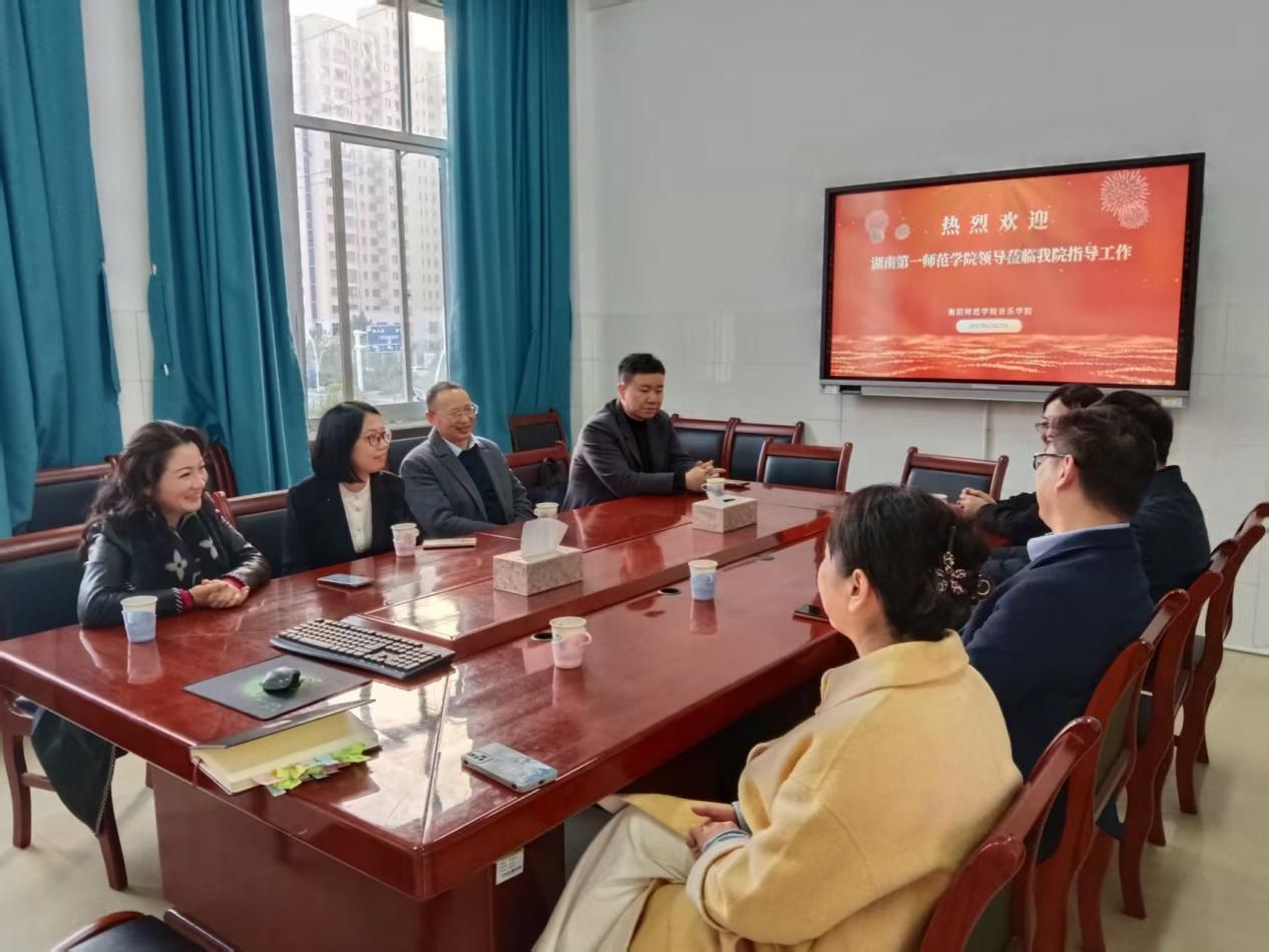 2025年12月17日下午,湖南第一师范学院副校长刘丽群带领一师音乐舞蹈学院党总支书记张福国、院长张瑞智等一行四人到访我院,围绕师范教育高质量发展开展专题交流。365英国上市集团副校长赵先超、英国365集团党总支书记谢学清、院长段桥生、副院长陈瑾出席交流活动。