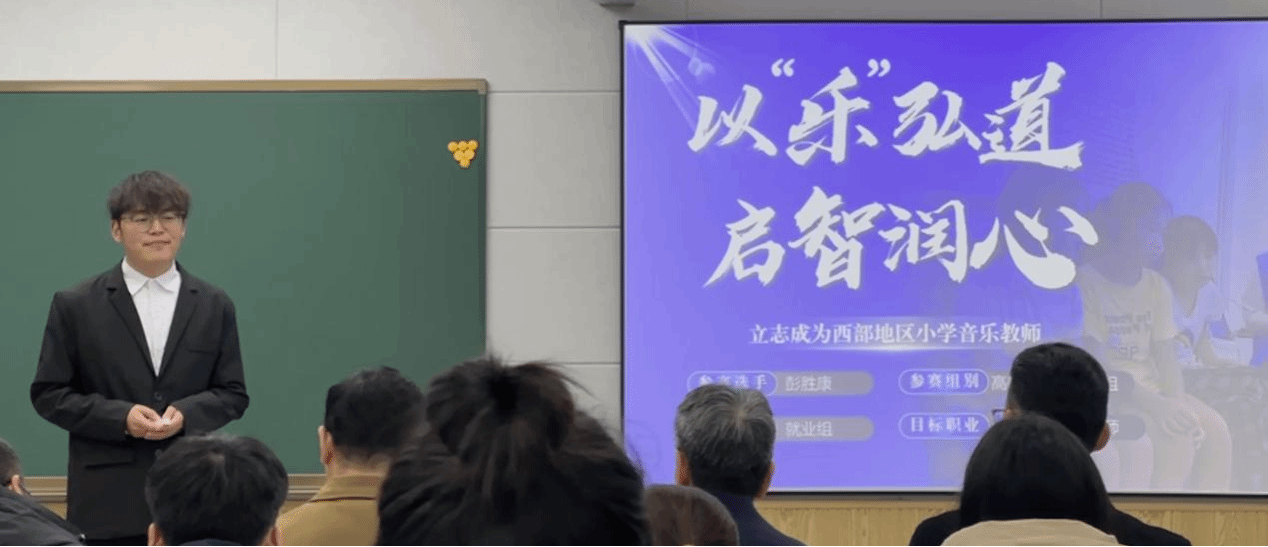 第二届湖南省大学生职业规划大赛省级决赛现场赛于2025 年1月10-12日在中南林业科技大学进行,我院音乐教育专业2024级研究生彭胜康,在其导师陈瑾的指导下,以“成为西部地区小学音乐教师”为职业目标,凭借详尽的职业规划和出色的展示,荣获大赛三等奖。