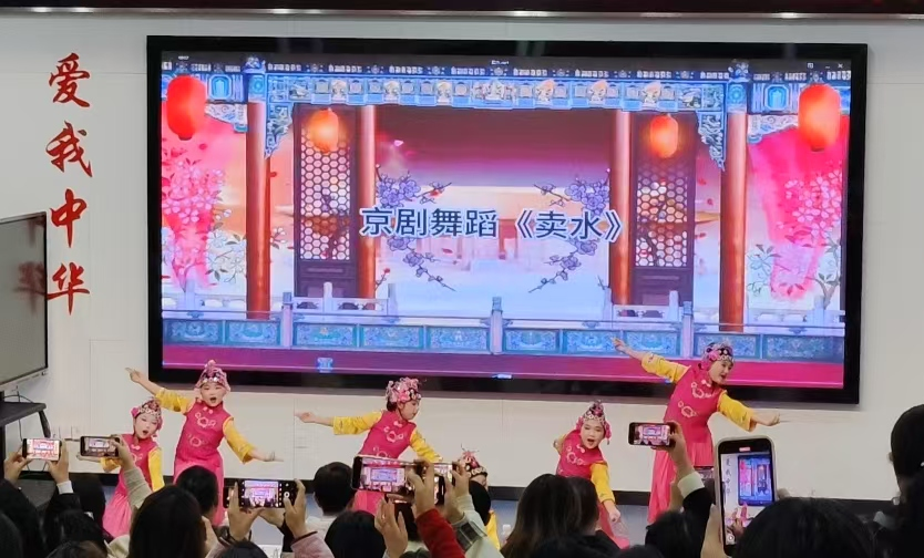 华耀小学的孩子们表演了京剧经典唱段《红灯记》《定军山》《卖水》等,小演员们精湛的“唱念做打”技艺赢得阵阵掌声。随后,学生们观摩了该校特色大课间活动——融合广播操、武术操与戏曲元素的“戏曲操”,充分展现了学校在学科融合与传统文化传承中的创新实践。