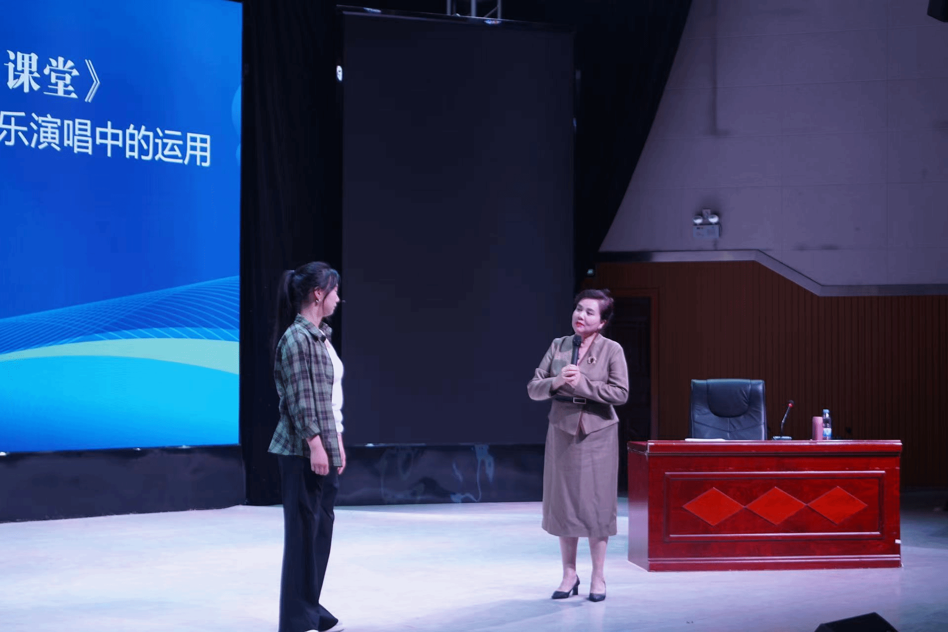 为进一步提升我院音乐专业硕士人才培养成效,2025年9月22日下午,国家一级演员、二级教授,湖南省文化馆女高音歌唱家,我院客座教授、音乐专业硕士研究生的行业导师付辽源教授,应邀到我院演艺厅开展主题为“声、台、形、表在声乐演唱中的运用”的学术讲座与实践教学。本次学术活动由院长段桥生教授主持,学院全体音乐专业硕士研究生和部分教师与本科生共400余人到场聆听。