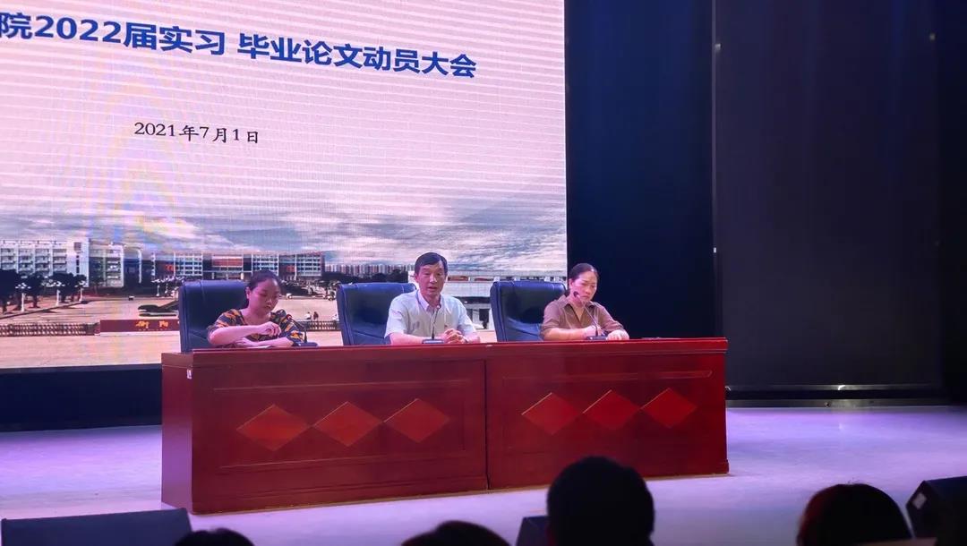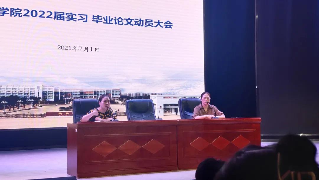为做好下学期毕业生实习实训期间的日常管理和安全教育,以及毕业生的毕业论文指导工作,7月1日下午英国365集团在音乐厅召开了2022届毕业生实习、毕业论文动员大会,会议由英国365集团党总支副书记陈雅斐主持,英国365集团院长段桥生、副院长陈瑾、18级辅导员黄鹤飞及2018级全体同学参加了此次会议。