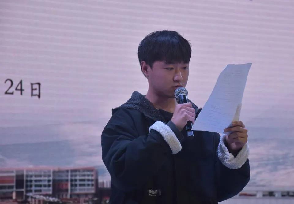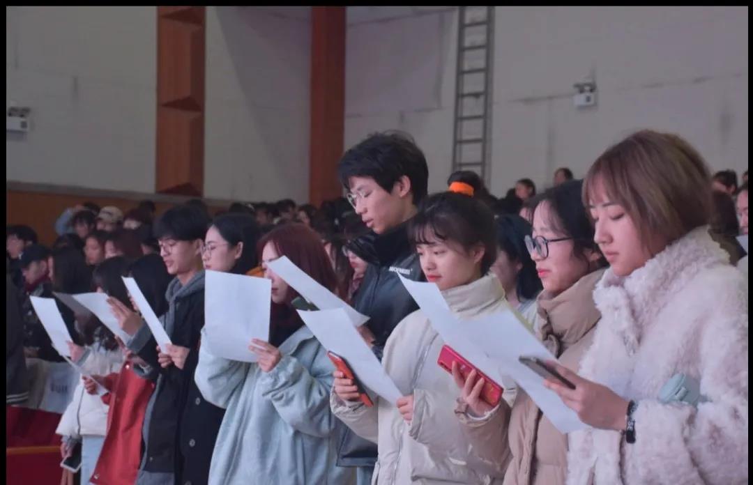 本次会议最后安排2019级音乐学二班曹双宇同学带领全体学生宣读大学生诚信考试承诺。