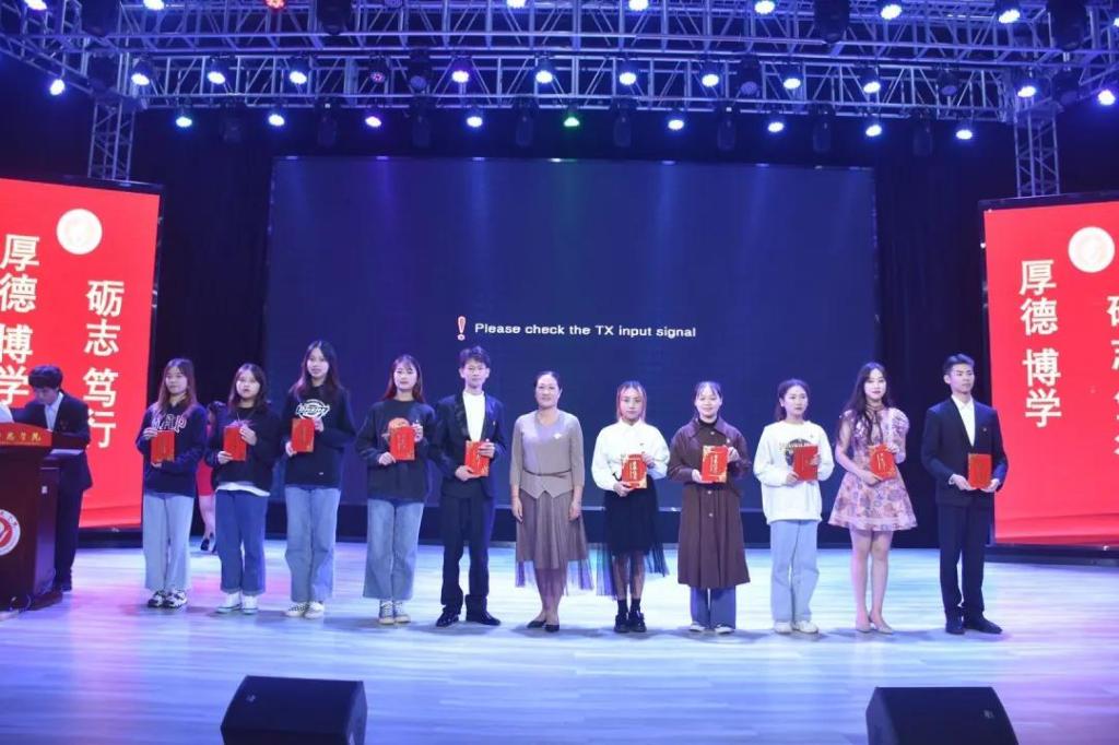 接下来,由党总支副书记陈雅斐,辅导员黄鹤飞、刘颖为19届十佳优秀学生干部、十佳心灵使者颁发荣誉证书,为19届各班班导颁奖。