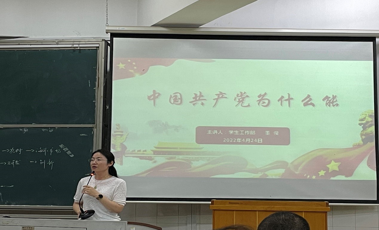 凌飞飞首先描述了党史发展的脉络及党史学习意义。她表明:“学习党史、‘以史明志’有利于发展党的思想政治建设,能够吸收党的发展历程中的成功经验并且发扬党的优良作风”。随后凌飞飞为同学们梳理了党史发展阶段的四个重要时期,其中重点提到了中共一大参会人员的历史故事,以此告诫同学们要在大学生活中努力学习,不要荒废大学时光。她还引用了《论语.述而》中的一句话,“德之不修,学之不将,闻义不能徙,不善不能改,是吾优也”,希望广大同学们积极学习党史,努力实践,不断提高自身素质,以实际行动争取早日成为一名优秀的共产党员。