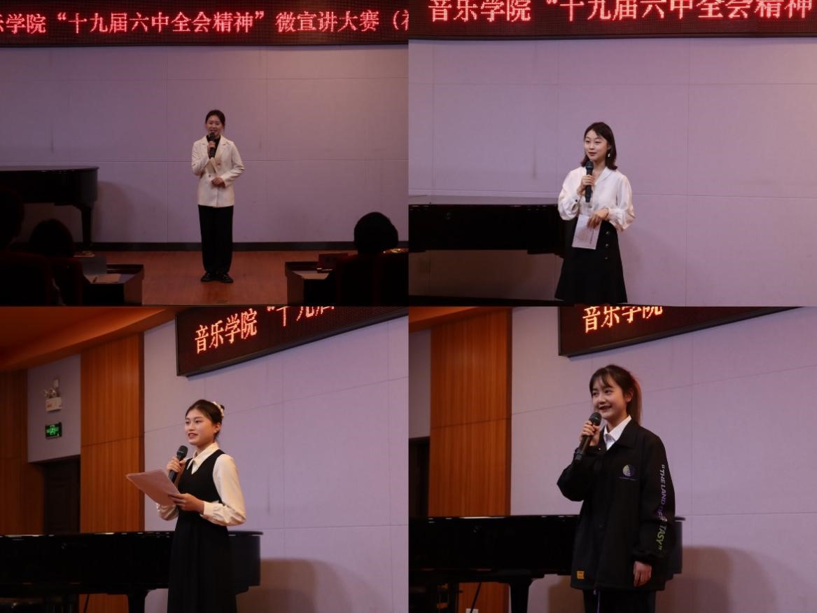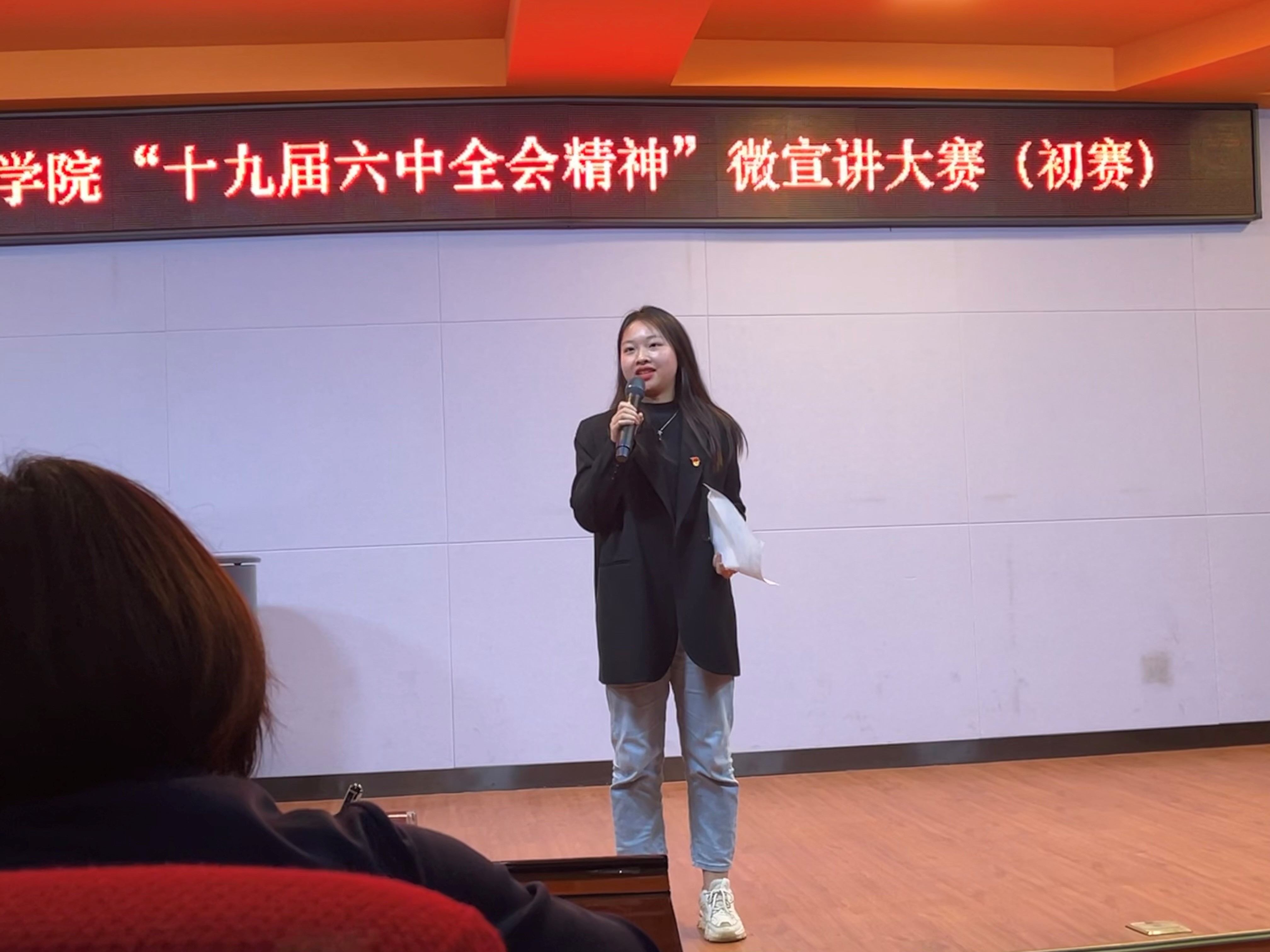 比赛开始,选手们依次上台宣讲,此次宣讲的主题围绕着中国共产党第十九届六中全会精神进行展开。在宣讲过程中,选手们宣讲的内容精彩,形式多样,有的以“问”、以“诗”开头,用激昂的语调和恰当的肢体动作把宣讲内容表达的淋漓尽致。还有的选手引用我院“小百灵”乡村音乐教室的事迹来诠释十九届六中全会的精神,其主题联系实际,用身边人、身边事说理,充分体现了微宣讲有高度又“接地气”的特点。