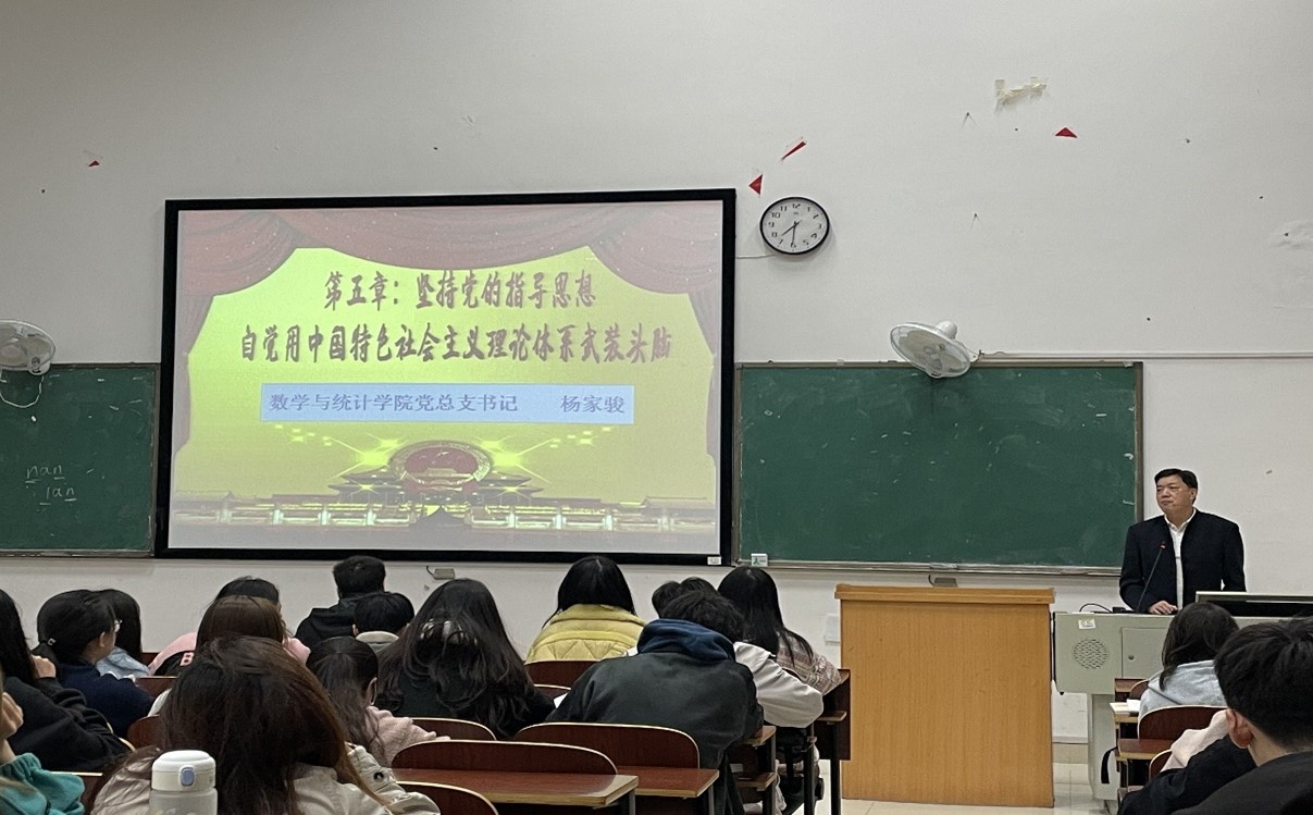 2021年10月21日晚7点30分,第64期入党积极分子班(五班)第四讲课于外语楼301教室顺利举行。本次培训由数学与统计学院党总支书记杨家骏书记主讲,主讲内容为:坚持党的指导思想,自觉用中国特色社会主义理论体系武装头脑。