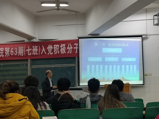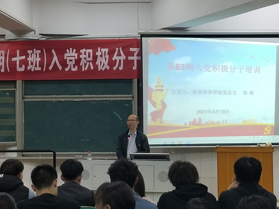 2021年4月15日晚7点30分,我院于音乐楼301教室举行了第63期入党积极分子培训第八讲—“增强组织观念,坚决维护党的团结统一”本次培训由体育科学学院党总支副书记陈铖同志主讲。