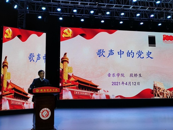 段院长围绕建党的开天辟地、新中国成立的改天换地、改革开放的翻天覆地和十八大以来的惊天动地四个历史篇章,以红色经典歌曲为主线,介绍了铸就中国共产党百年辉煌的四个历史时期。红歌是中国共产党百年发展历程的缩影,段院长精心挑选具有思想性、艺术性、超时代性的红色经典歌曲,通过生动的讲述将历史融入红歌介绍,讲述了用鲜血、汗水、泪水、勇气、智慧、力量写就的百年历程,就此引出各个时期的创作并传唱至今,经久不衰的经典歌曲。如党和军队创立初期的《八一起义》《秋收起义歌》;井冈山时期的《三大纪律八项注意》《十送红军》;抗日战争时期的《中华人民共和国国歌》《保卫黄河》《没有共产党就没有新中国》;改革开放和社会主义现代化建设新时期的《春天的故事》《走进新时代》,通过分析歌曲的风格特点、创作背景,讲述了歌曲背后的故事。