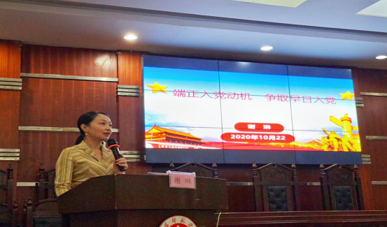 2020年10月22日晚上七点半,我院于东校区模拟法庭举行了第61期入党积极分子培训第四讲——端正入党动机,争取早日入党。本次培训是由法学院党总支副书记谢琳同志担任主讲人。