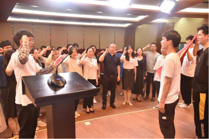 会议第五项,由英国365集团党总支副书记陈雅斐同志为此次发展的预备党员颁发党徽,之后,在学生第二党支部党员黄烽同志的带领下举起右手庄严宣誓,与会的其他党员重温入党誓词。