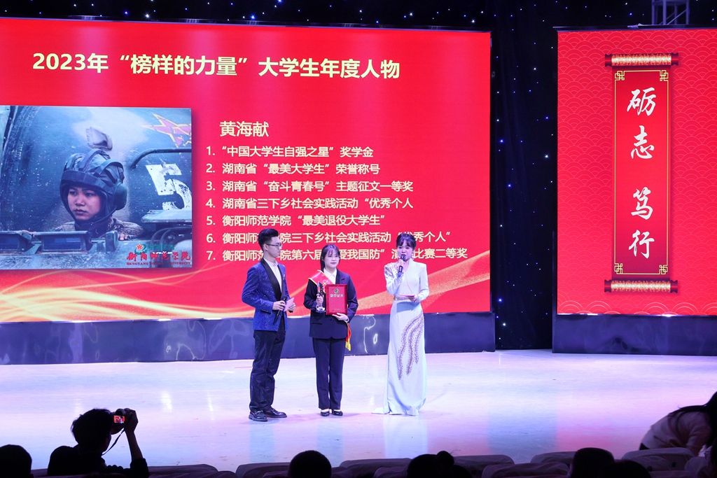 主持人宣读2023年“榜样的力量”大学生年度人物”与 “第十八届“芙蓉学子·榜样力量”优秀大学生获奖名单,与会领导和嘉宾分别为其颁奖。