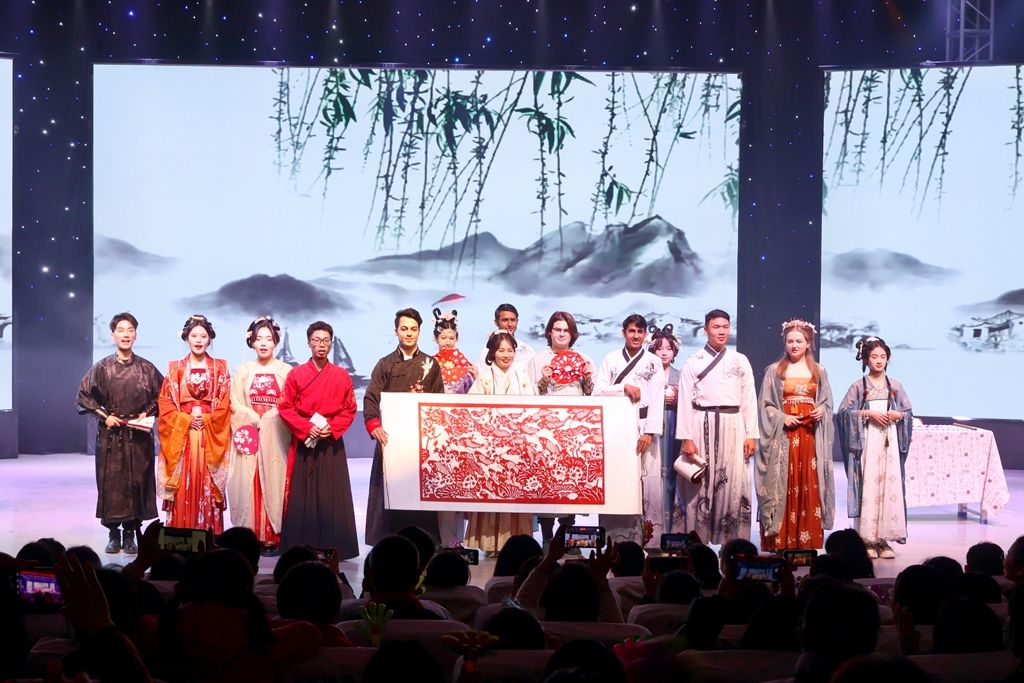 “云飞丝路飘花雨,风动驼铃运锦绸” ,中外友人联合呈现的传统文化展示节目《丝路情深》,描绘出丝绸之路上的风物与繁华,再现了中华优秀传统文化“各美其美,美人之美,美美与共,天下大同”的丰富内涵。来自于巴基斯坦、越南、哈萨克斯坦、泰国、印度的留学生们在衡师与中国传统文化相识、相知、相遇,他们身着汉服、朗诵诗歌、表演书法、剪纸团花,手捧剪纸长卷,与衡师青年共同为全校师生送上“年年有余,幸福美满”的美好祝愿。
